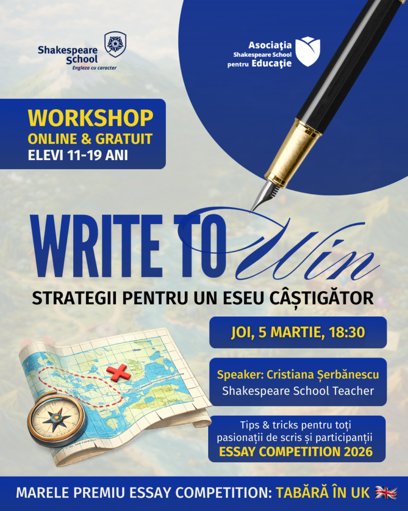 Înscrie-te la a 18-a ediție Shakespeare School Essay Competition și lasă-ți talentul să vorbească! Tot ce ai nevoie este creativitate, originalitate și pasiune.