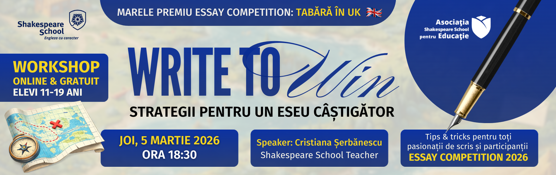 Workshopul în limba engleză „Write to Win: strategii pentru un eseu câștigător” îți arată, pas cu pas, cum să scrii un eseu original — ideal pentru 🔗 Shakespeare School Essay Competition 2026, dar util și pentru orice alt proiect de scriere creativă.